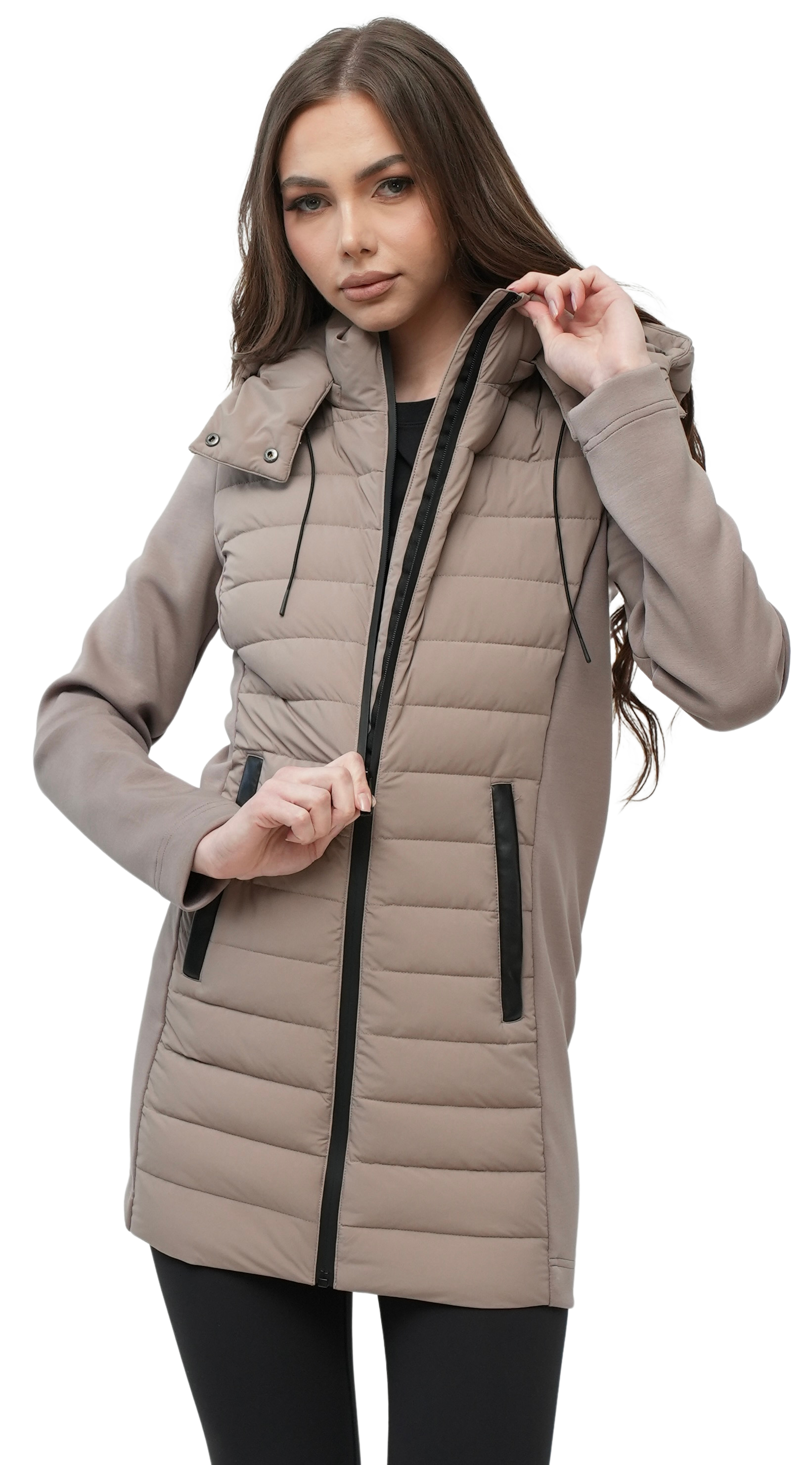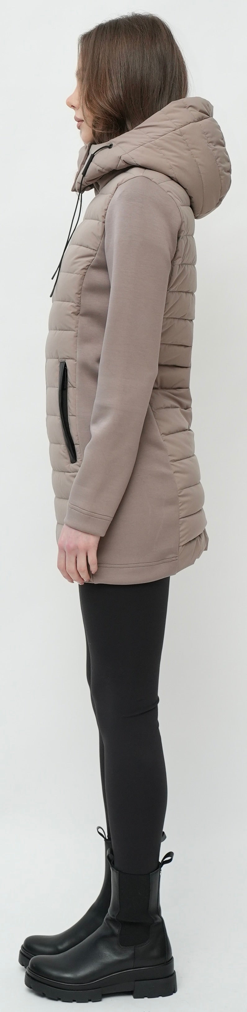 - Detachable Quilted hood with snap closure and bungee cord