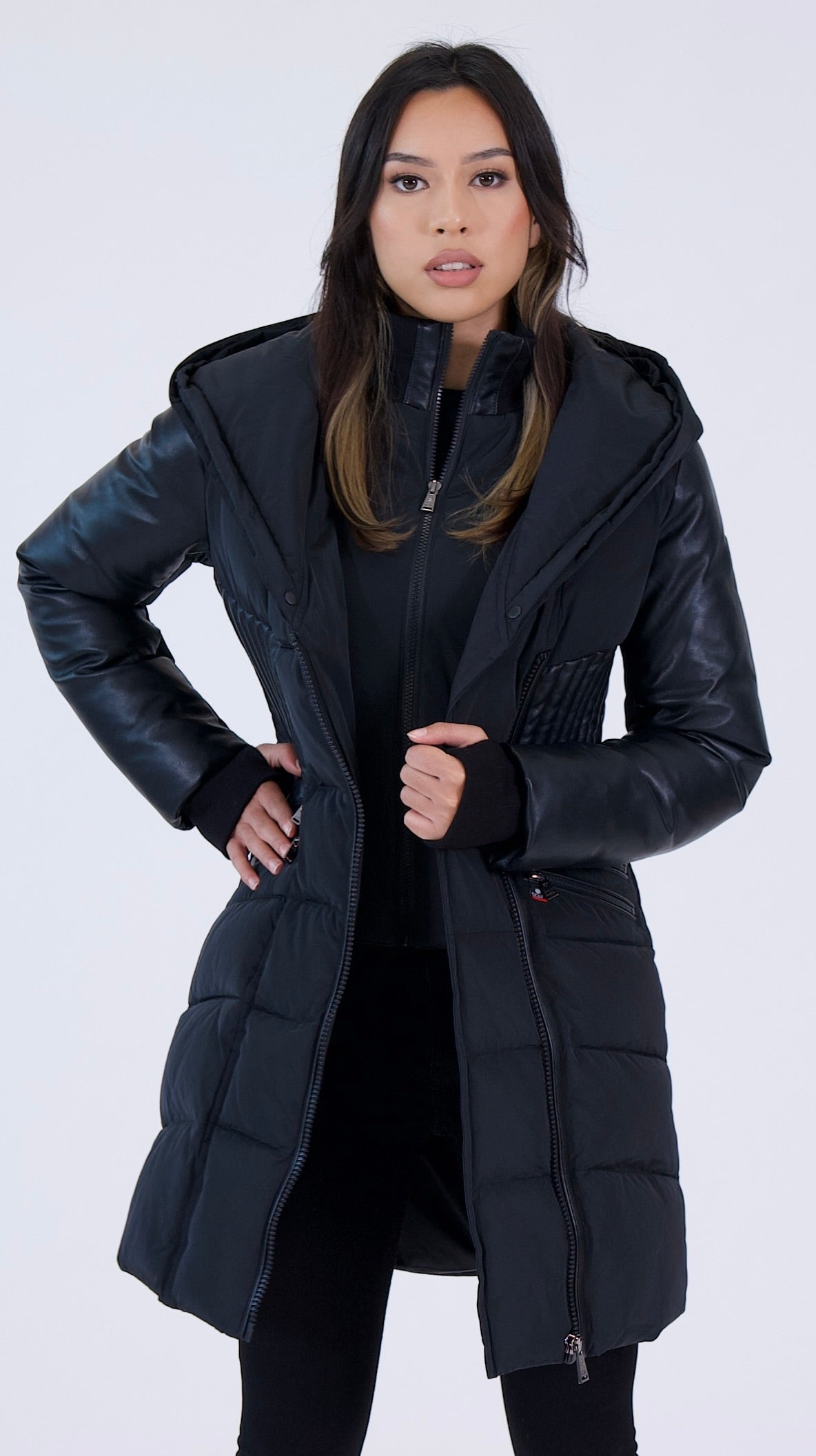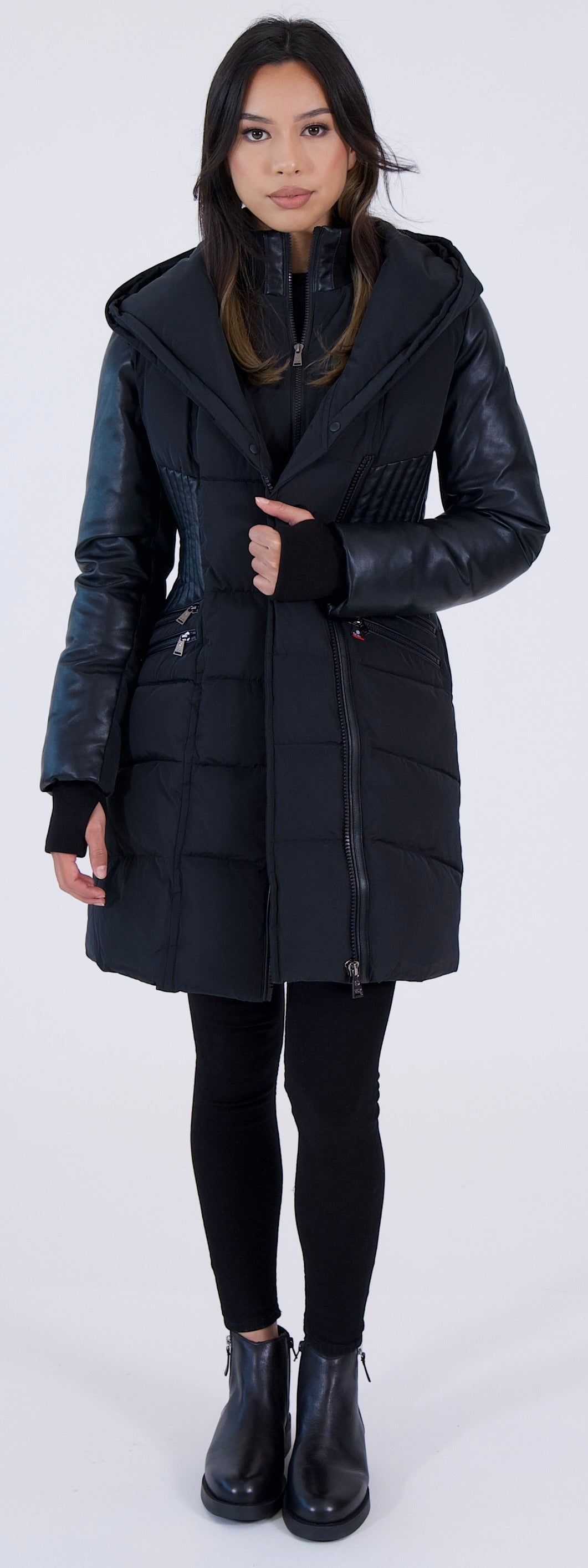 - Poches avant zippées avec chauffe-mains avec bordure en cuir véritable